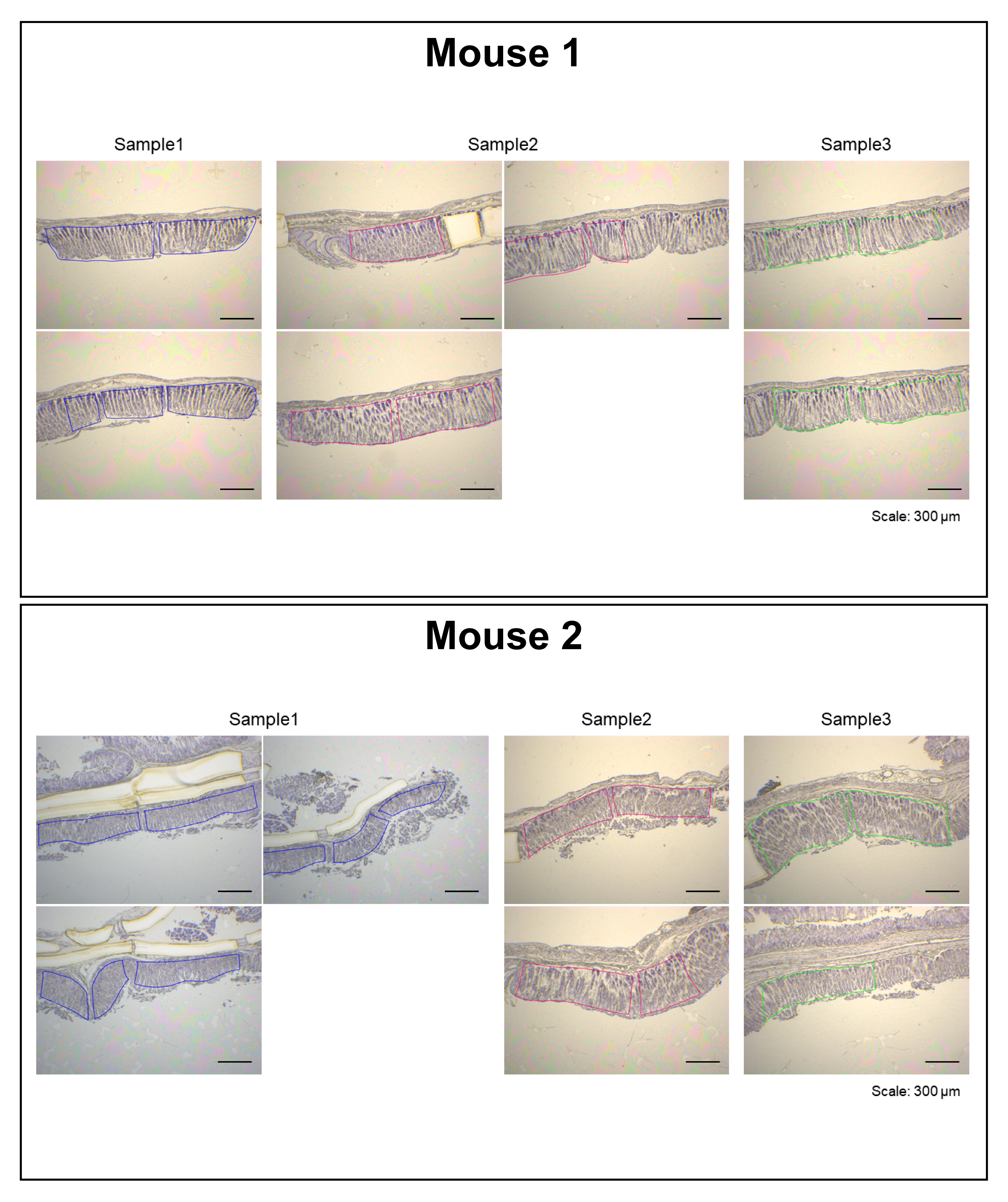 Tissue dissection using an LMD7000 LMD system (Leica Microsystems) and subsequent protein extraction were performed, tissue fragments (total area of 0.13-0.91 mm^2) were dissected from hematoxylin-stained sections and collected in a tube. After centrifugation at 20,000 g for 1 min at 4∘C, the fragments were heat-denatured in 200 µL of 10 mM citrate buffer, pH 6.0 for 1 h at 95∘C. After centrifugation at 20,000 g for 1 min at 4∘C, 4 µL of a 50% (w/v) slurry of microcrystalline cellulose in Dulbecco's PBS (D-PBS) was added. After discarding 190 µL of the supernatant and adding 190 µL of D-PBS, the fragments were subjected to protein extraction using 20 µL of D-PBS containing 0.5% Nonidet P-40 by sonication. After incubation for 1 h on ice and centrifugation at 20,000 x g for 1 min at 4∘C, the supernatants were collected as protein extracts. |